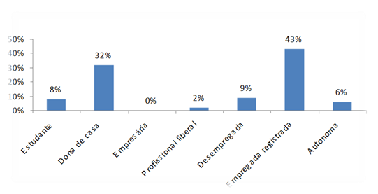 Na pergunta sobre principal ocupação, 8% das mães declararam ser estudantes, 32% do lar, 2% das mães profissionais liberais, 9% desempregadas no momento da entrevista, 43% relataram serem empregadas registradas e 6% das mães disseram ser autônomas (Gráfico 3).